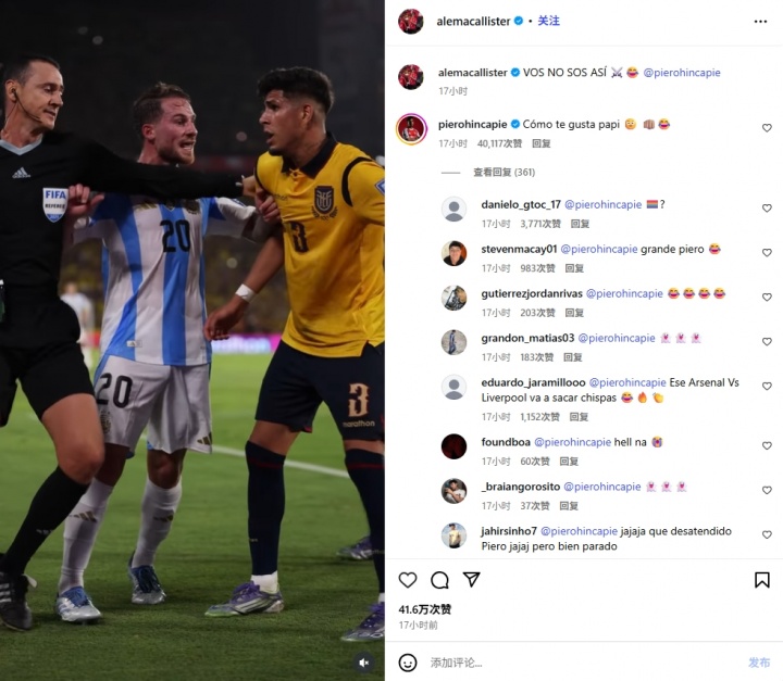 赛后麦卡利斯特和因卡皮耶在社媒上有爱互动,麦卡发社媒还原了当时他说的话:你不是这样的。